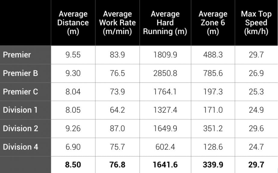 - The largest differences were observed when it came to Hard Running and Sprint distance for Premier and Premier B clubs compared to Division 1 and 4.